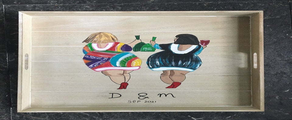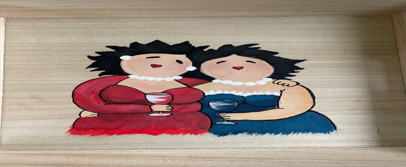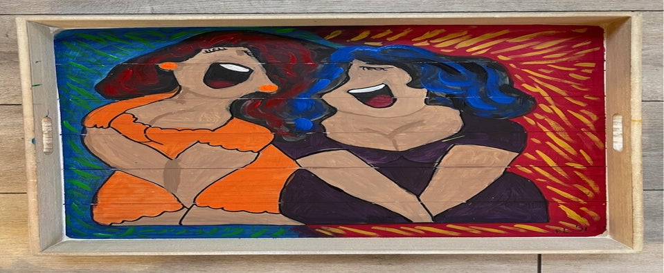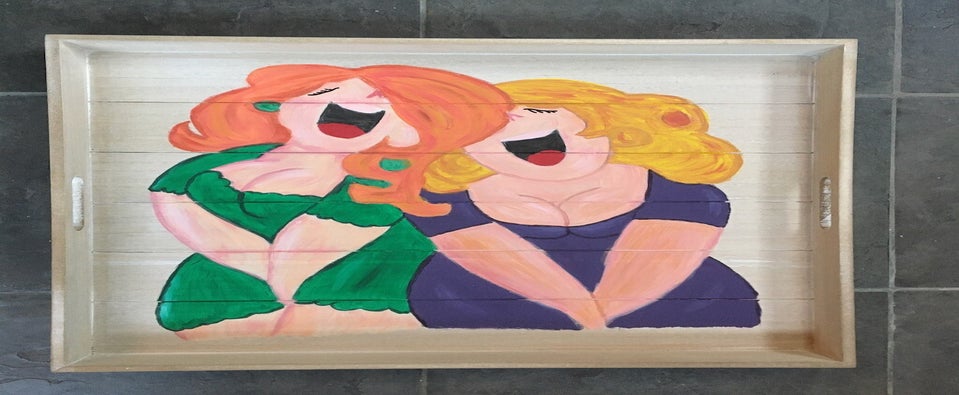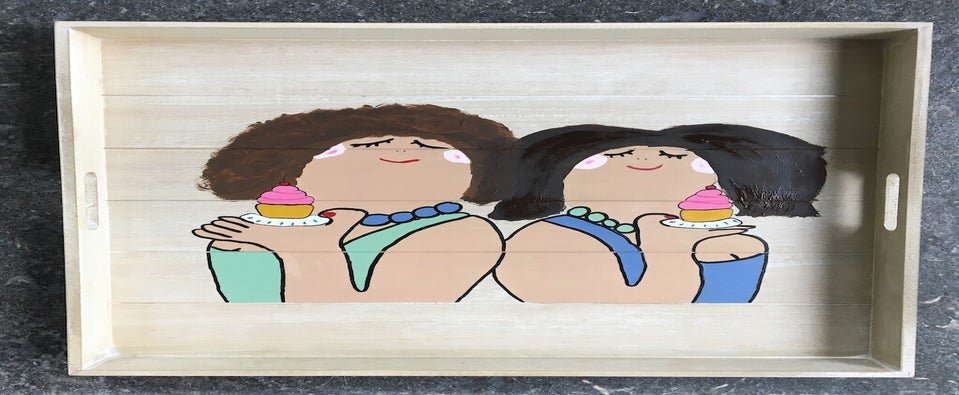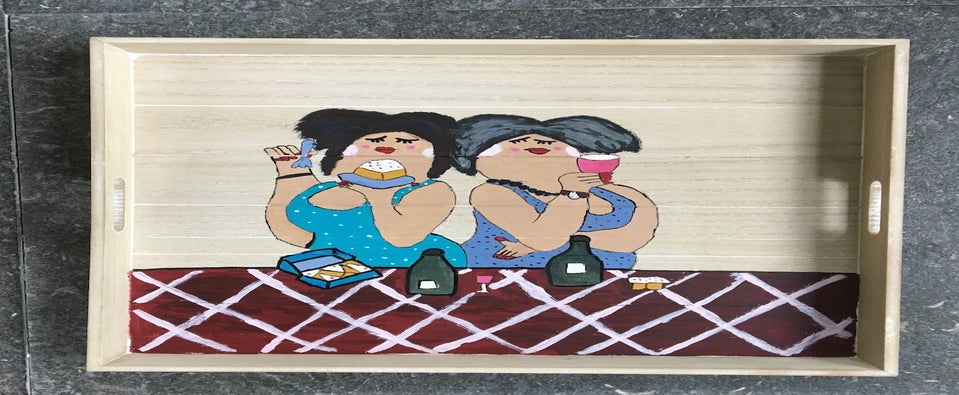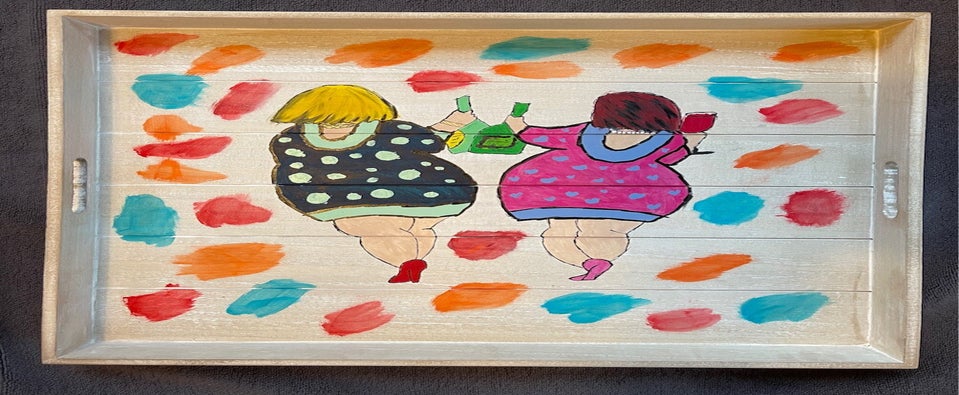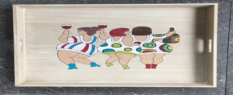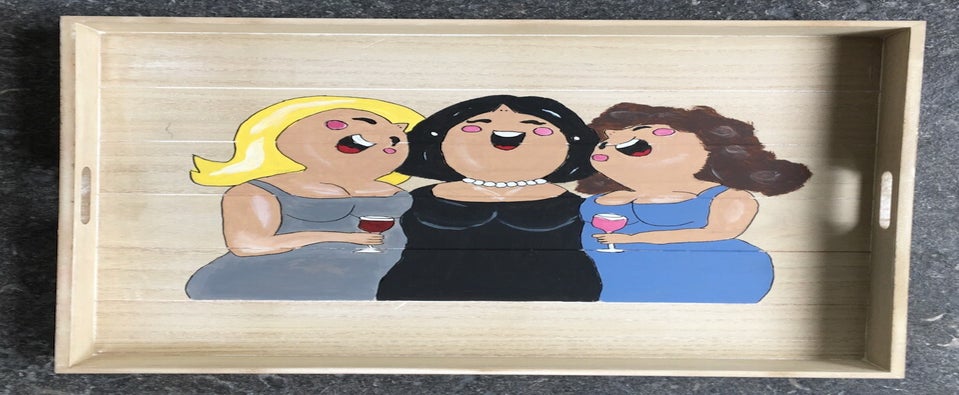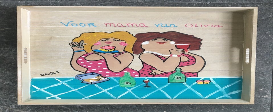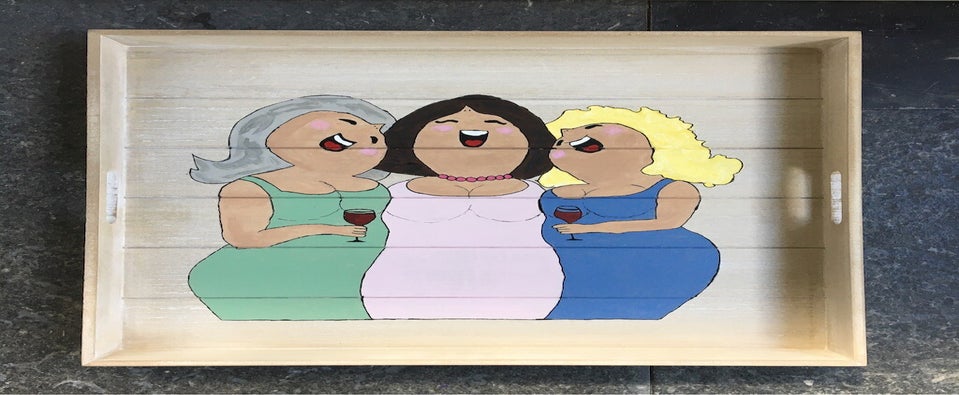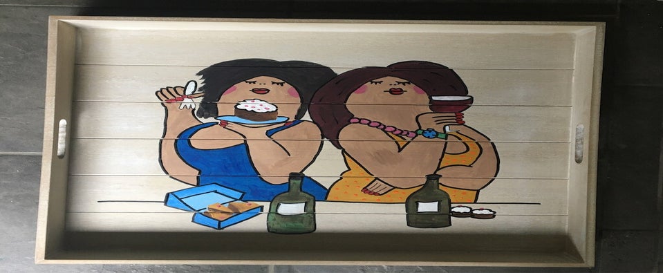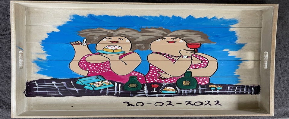 Schilder vrolijke hartsvriendinnen op dat mooie supergrote presenteerblad, idee: workshop uitje vriendinnen. Zo’n XXL houten formaat is onmisbaar in huis. Op dit dienblad passen kopjes, bordjes, wijnglazen, schaaltjes en dat allemaal tegelijk. Kies uit de vele plaatjes en maak alles mooi middels verschillende kleuren acrylverf. Je zult veel plezier hebben van deze keuze en gaat naar huis plus prachtig resultaat, zeker weten. Workshops creatief in Brabant.